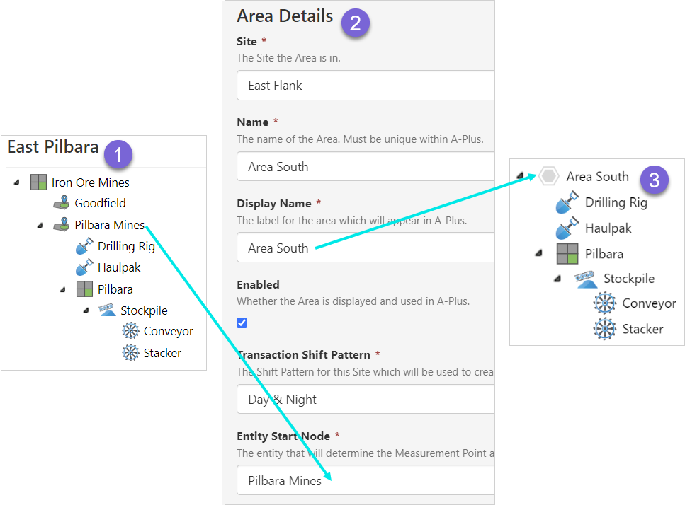 An area entity from the hierarchy is assigned to the Entity Start Node in the site area configuration. This part of the hierarchy then forms the equipment hierarchy in A-Plus for that particular site area, and is known by the name of the site area.