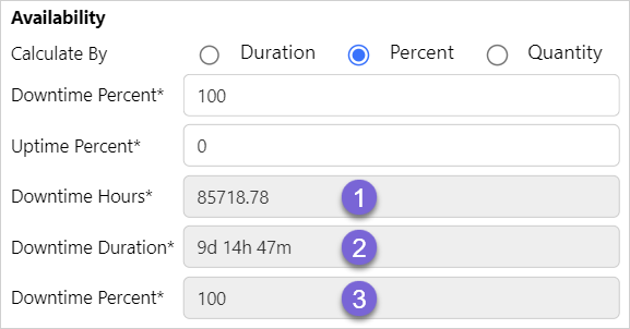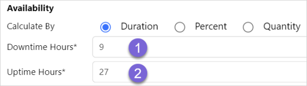 Calculate by Duration enables the Downtime and Uptime hours to be entered to determine the equipment availability.
