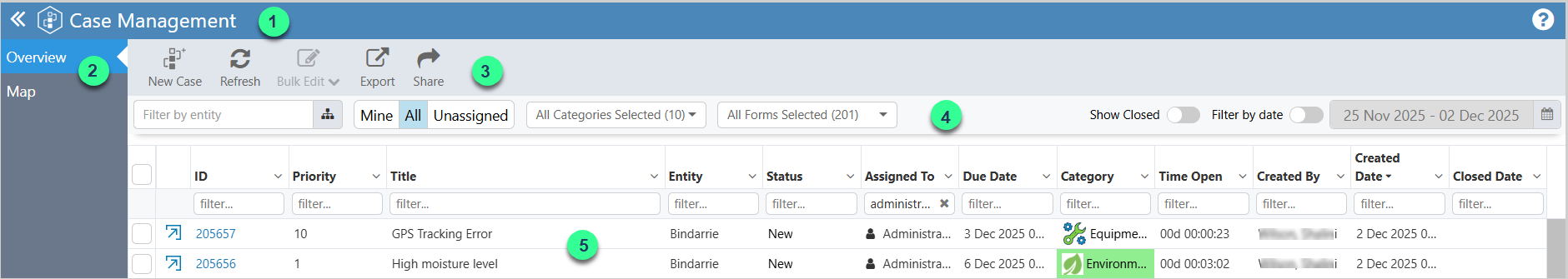 The Overview page contains buttons to add a new case, refresh the table, perform bulk editing of cases, export data and Share a Link to the Case Management Page.