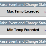 The Min Max process in Sentinel tests continuous data (supplied by the Temperature input) against a maximum limit (Max Temp) and a minimum limit (Min Temp). Here is an example of how you can create this in Sentinel Studio.