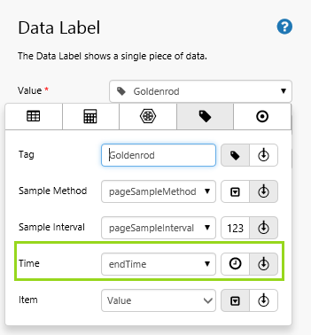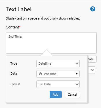 2. Drag a Text Label onto the top right grid cell. In the text label's Content type End Time: then click Add Data and add the page variable endTime with a Full Date format.