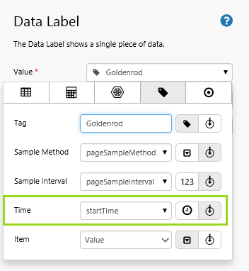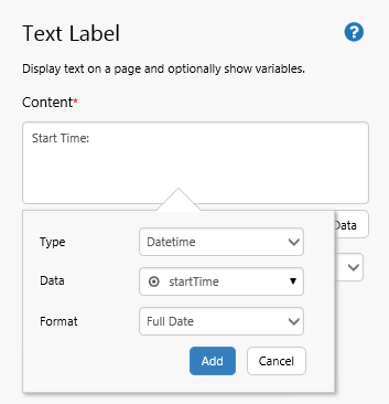 1. Drag a Text Label onto the top left grid cell. In the text label's Content type Start Time: then click Add Data and add the page variable startTime with a Full Date format.