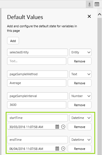 Note how startTime and endTime are already in the Default Values list panel; these are page defaults.