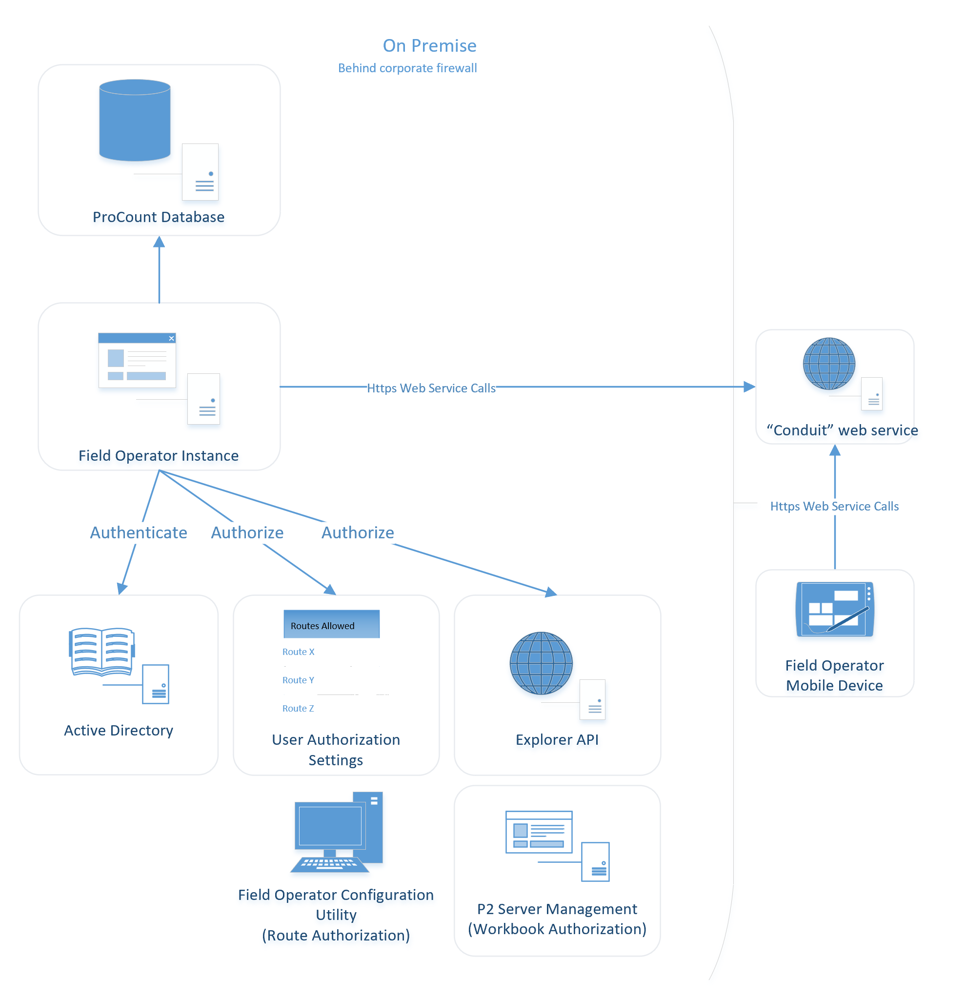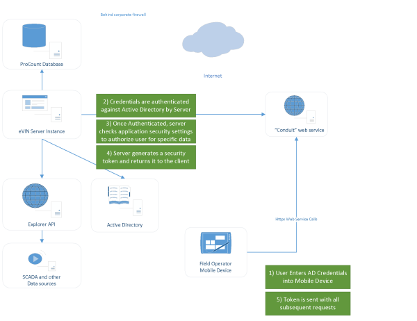 In most implementations Field Operator uses the corporate Active Directory for authenticating users. Only users with valid domain credentials can access any data. The list of ProCount routes to which a user is authorized to download comes from the eVIN Security settings set in the Field Operator Configuration Utility (same as with the eVIN Laptop app). The list of workbooks to which a user has access is retrieved from the Explorer API. Explorer security settings are set in the IFS OI Server Management web page.