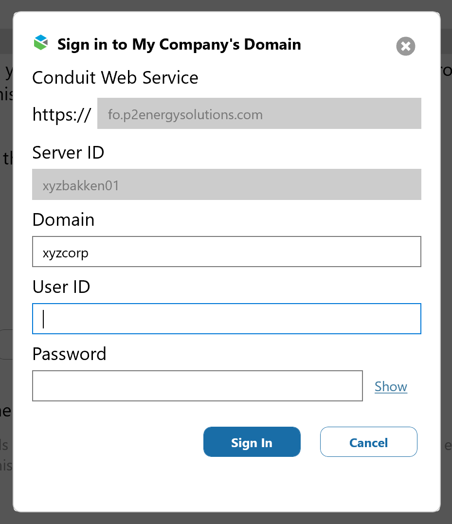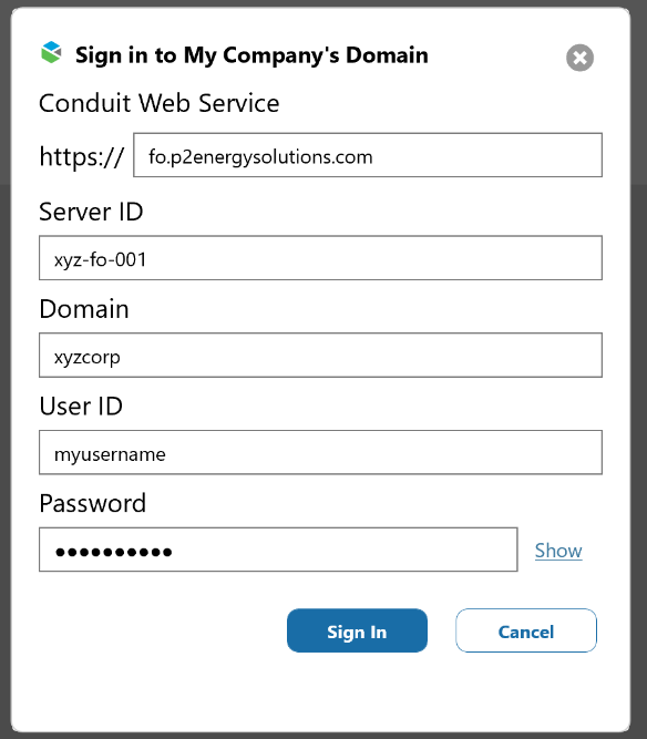 - The Conduit Web Service URL (defaulted to fo.p2energysolutions.com which is typical)