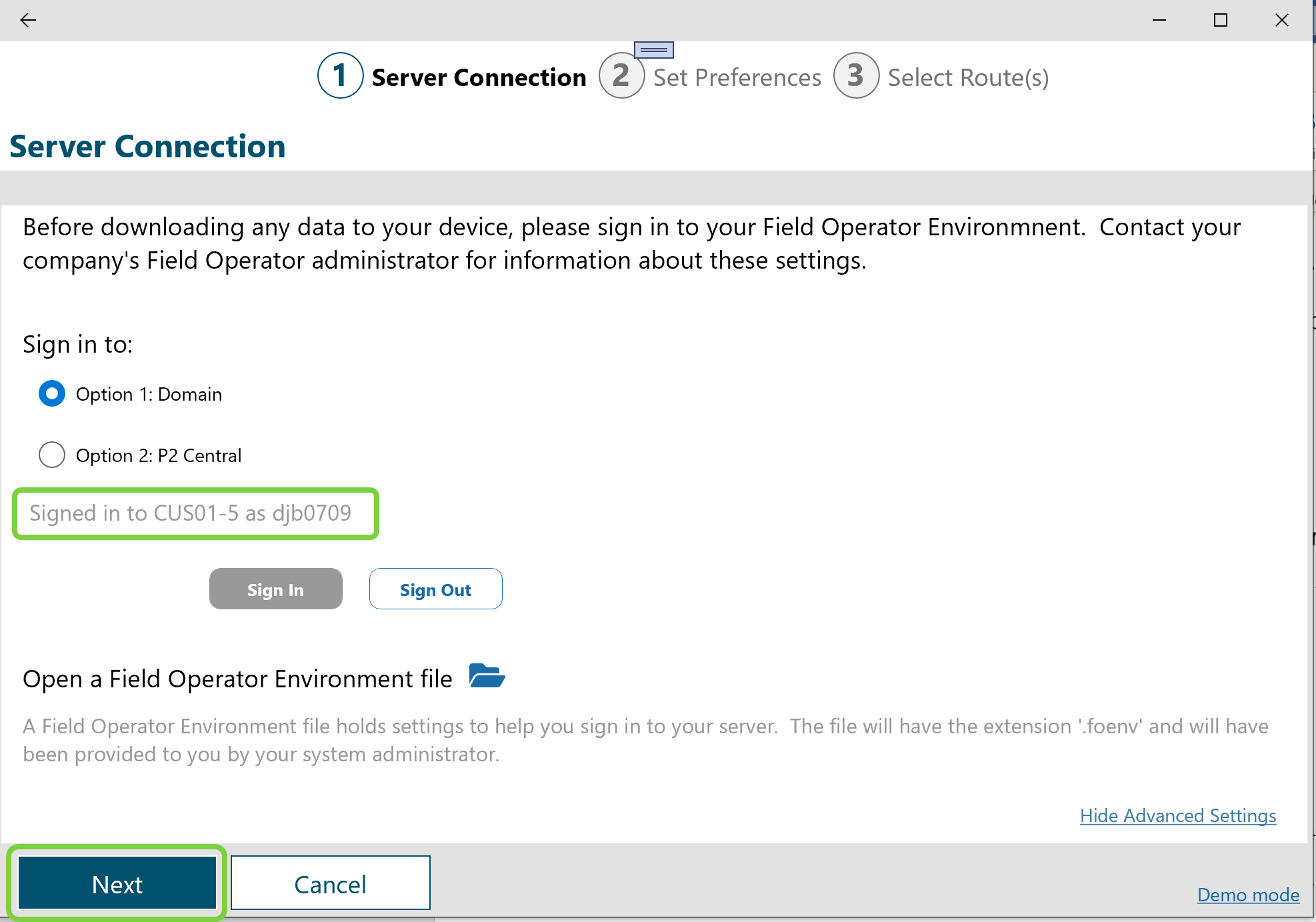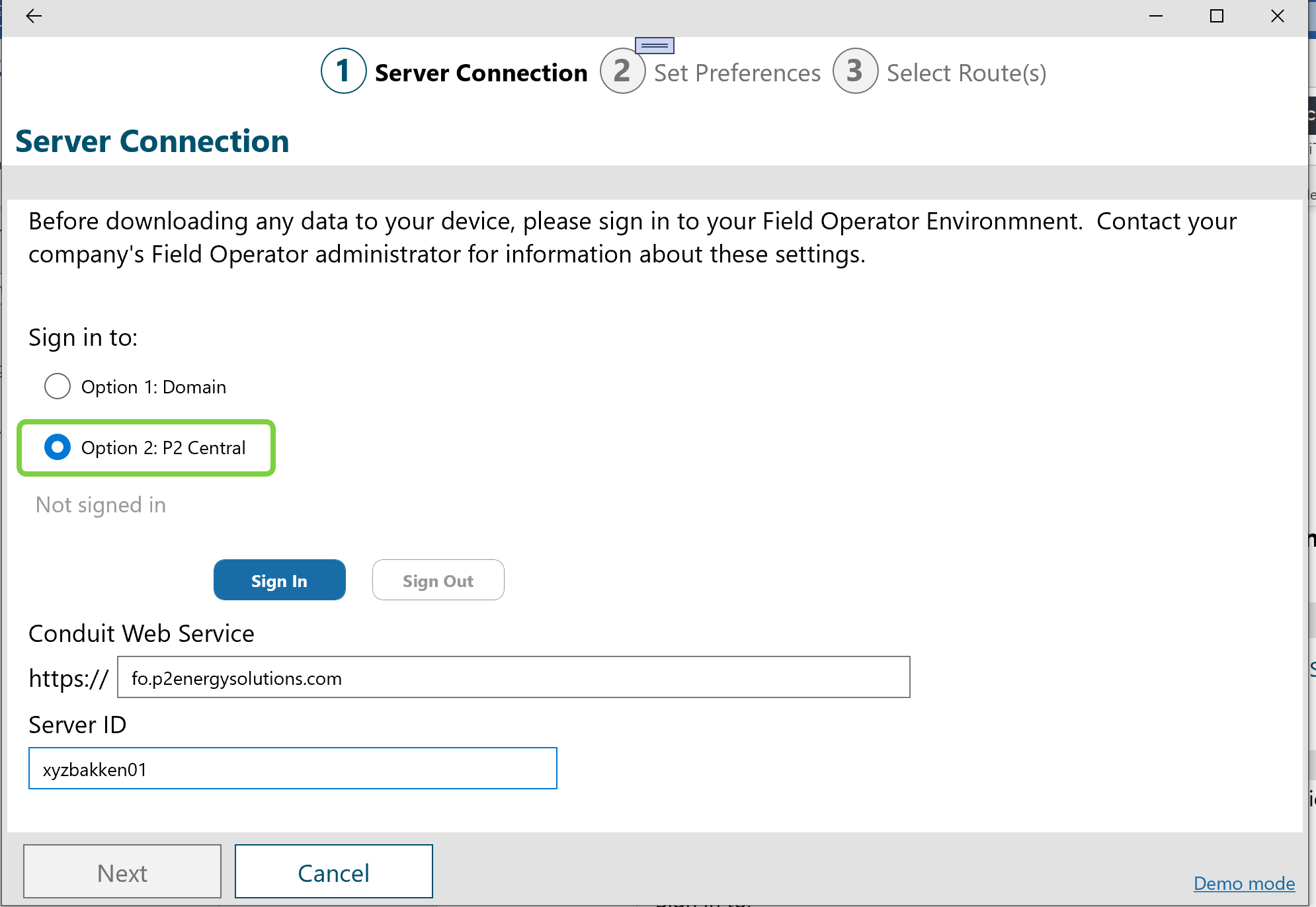 Once the status shows the user to be signed in to IFS OI Central and the server id is correctly entered, the Next button will bring the user to list of routes and/or workbooks for which they are authorized.