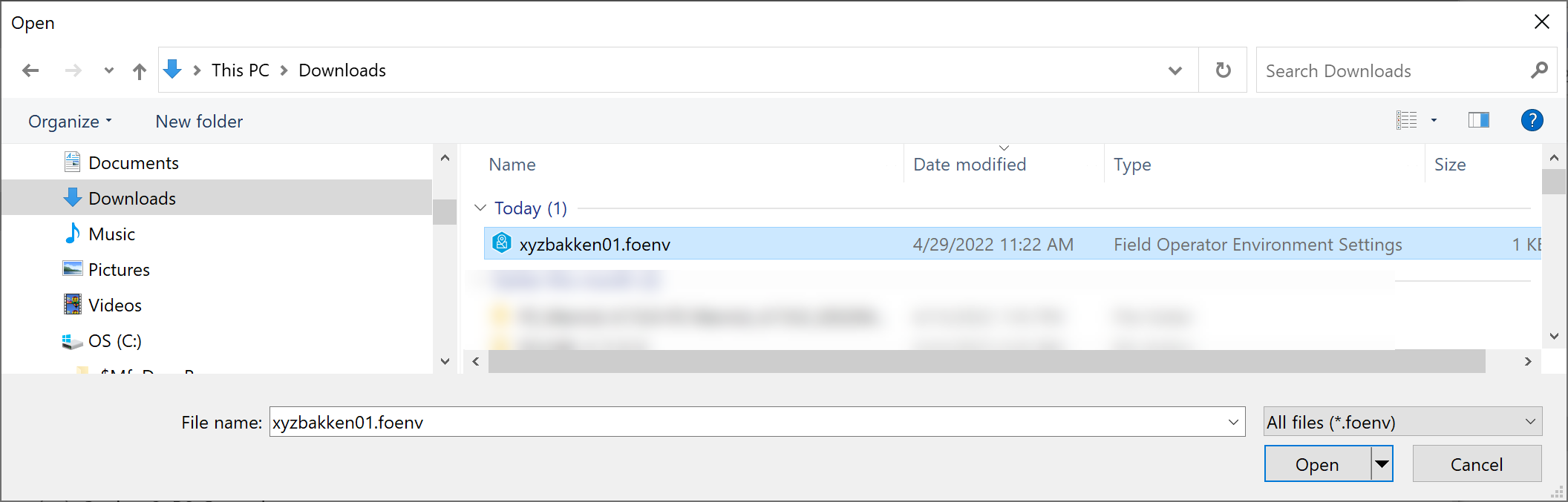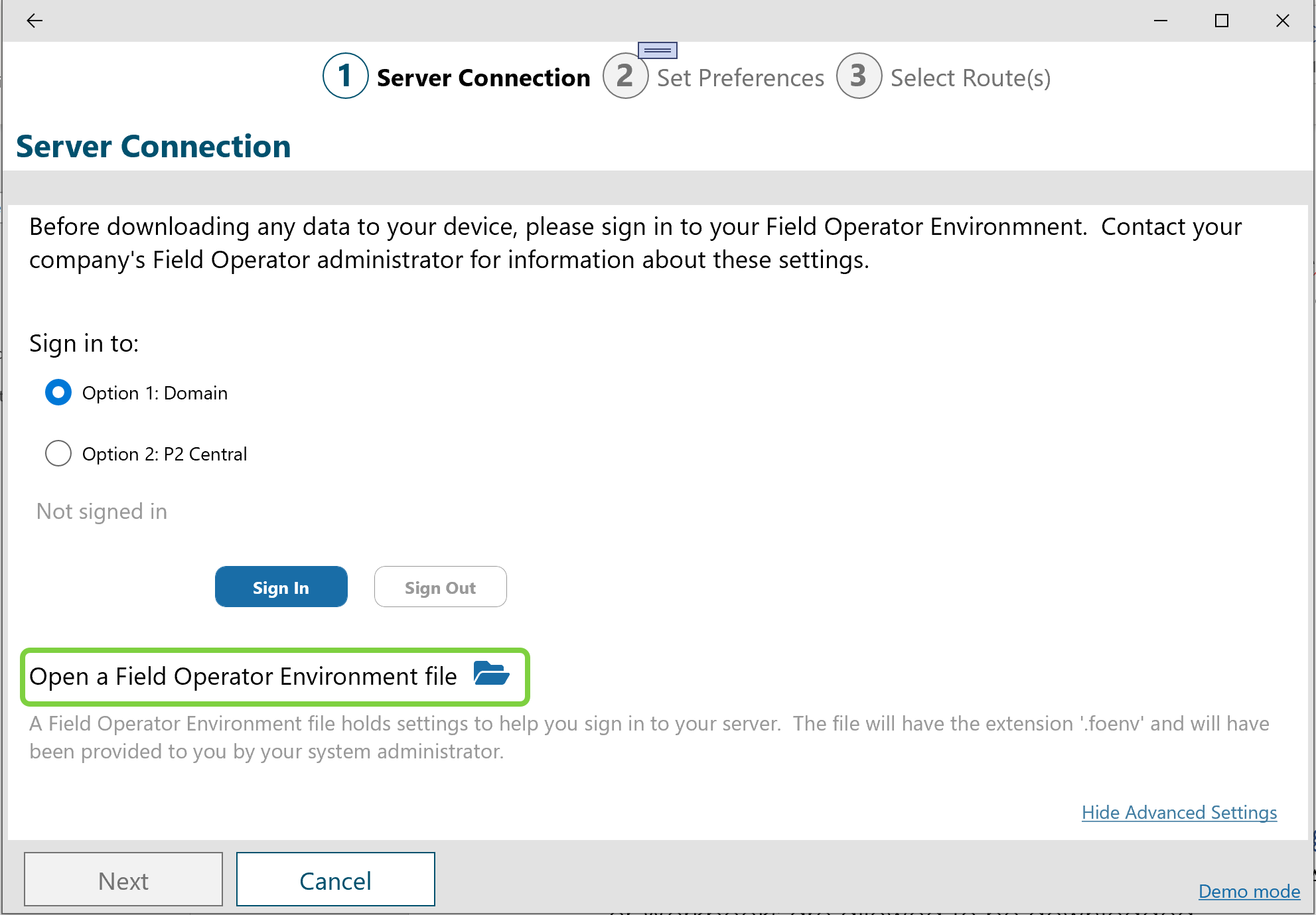 If you’ve sent the Field Operator Environment file (“.foenv”) via email, the user should select Save As to store the file locally. Then the user will visit the Server Connection screen and select Open a Field Operator Environment file: