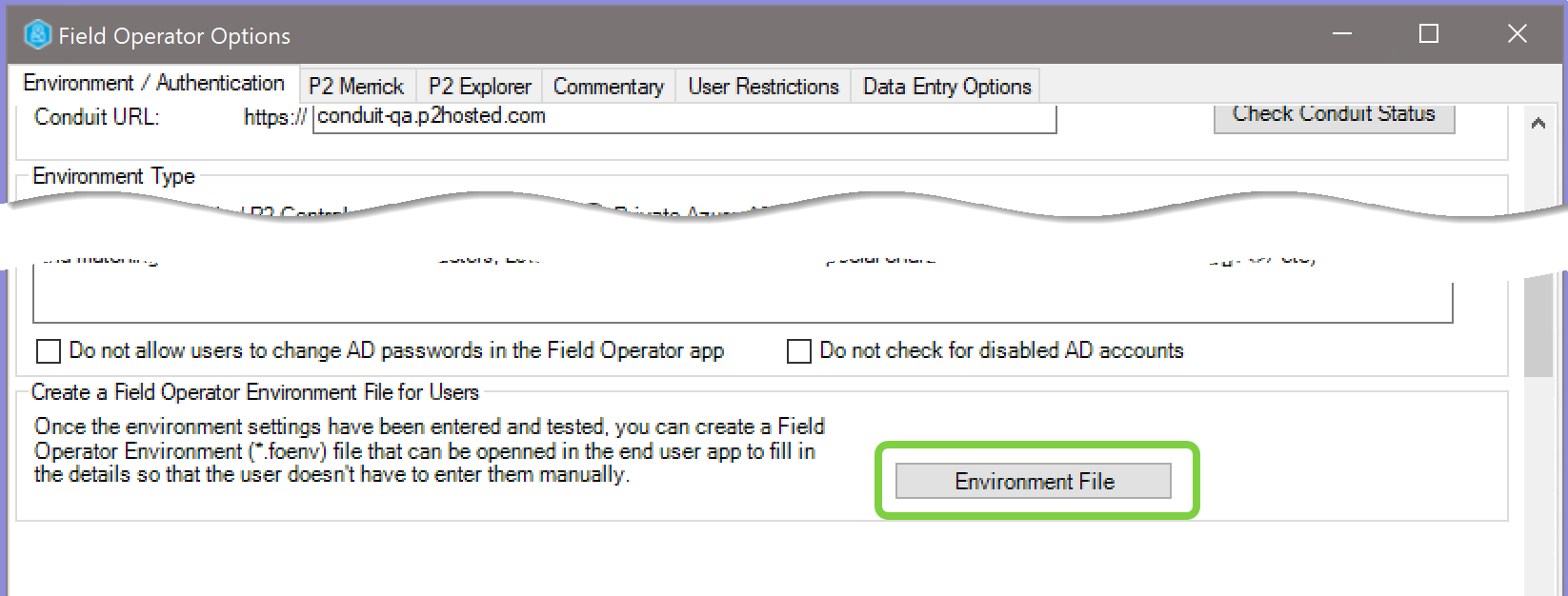 After configuring and saving the options for a Field Operator instance, return to the Environment / Authentication tab of the Field Operator Options screen and select the Environment File button.