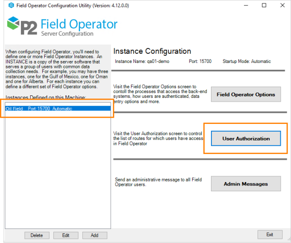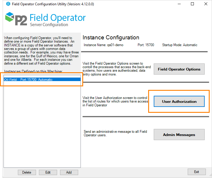 The User Authorization dialog for the Instance is opened from the Field Operator Configuration Utility.