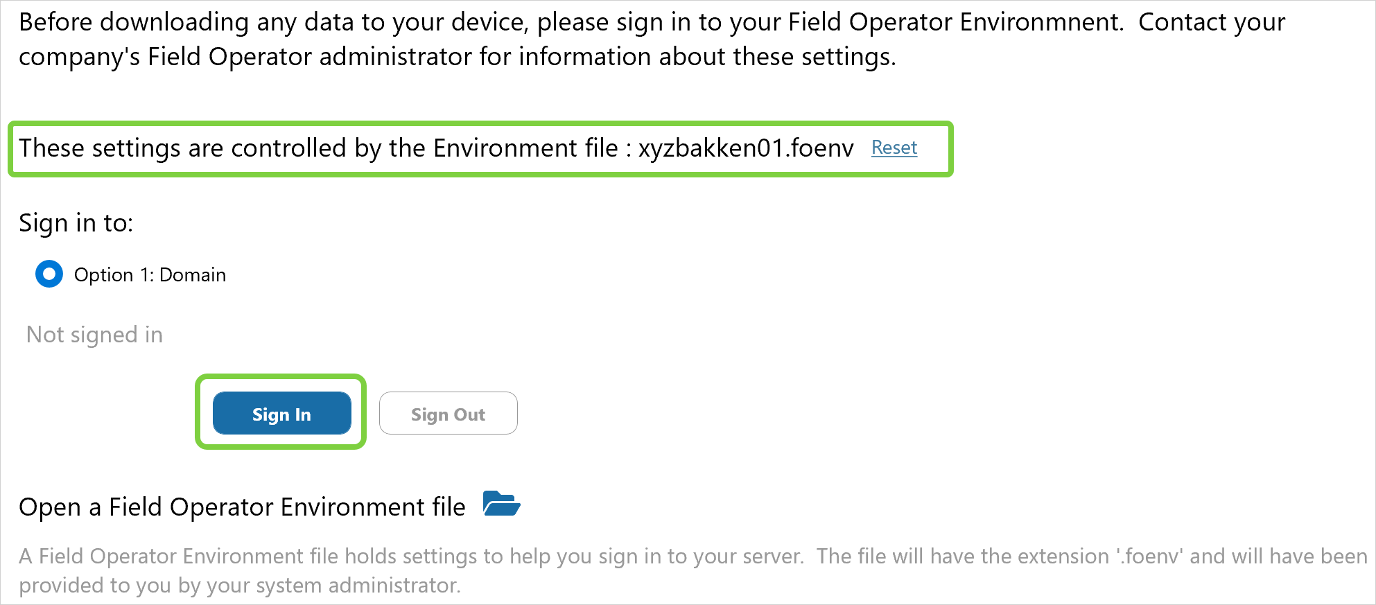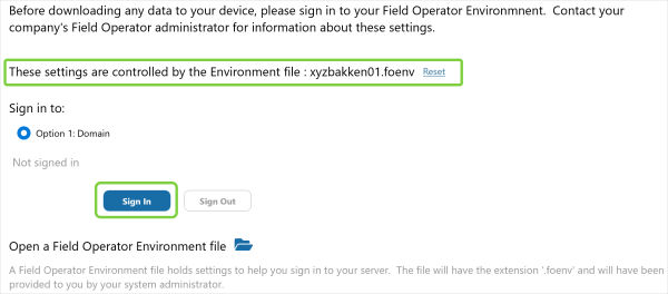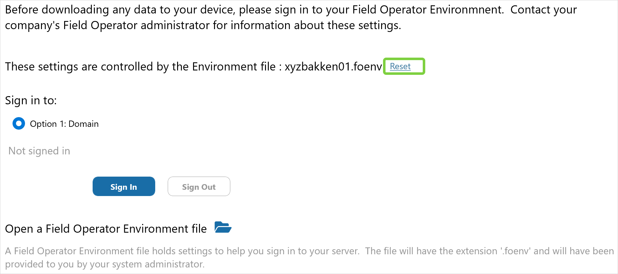 If an advanced user needs to connect to a different server, (for example, to connect to a different environment for testing a new version of the app), the user can either open a different “.foenv” file or click Reset to enter the settings manually. (please note Known Issue Switching Environments).