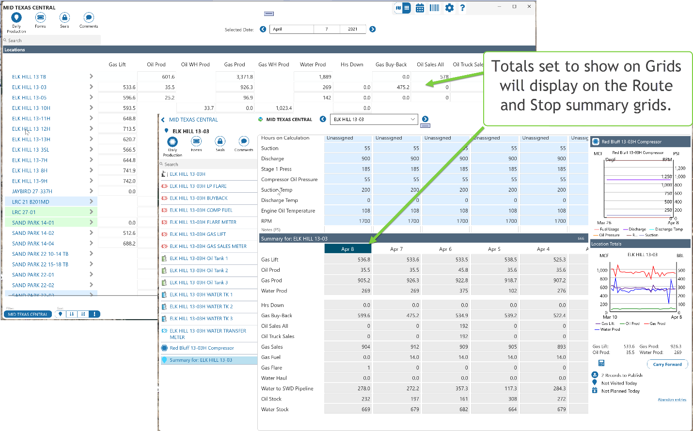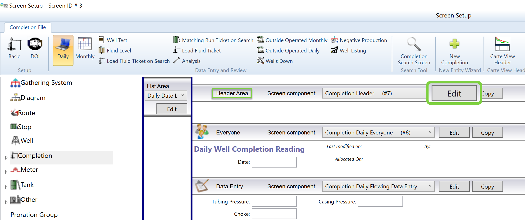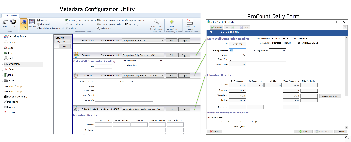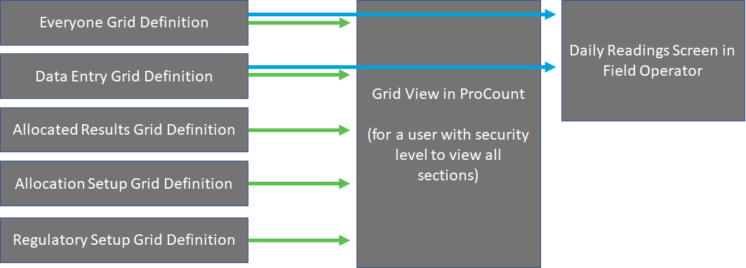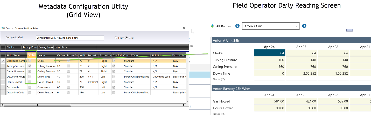 Additionally, the Daily Reading screens in Field Operator are driven by the Grid View of the screen configuration. The grid in ProCount / Carte and the Daily Reading screen in Field Operator are derived by combining the fields from grid configuration of each section of the screen.