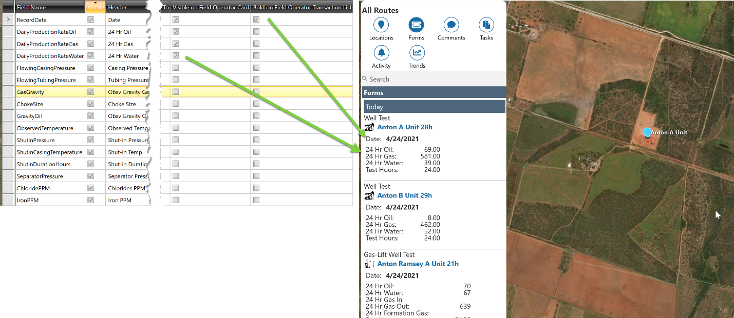 In Field Operator’s Map View, when the user selects the Forms, a list of ‘cards’ displays the readings for the last few days. These are configured by selecting the Visible on Field Operator Card and Bold on Field Operator Transaction List attributes in the Grid View configuration.