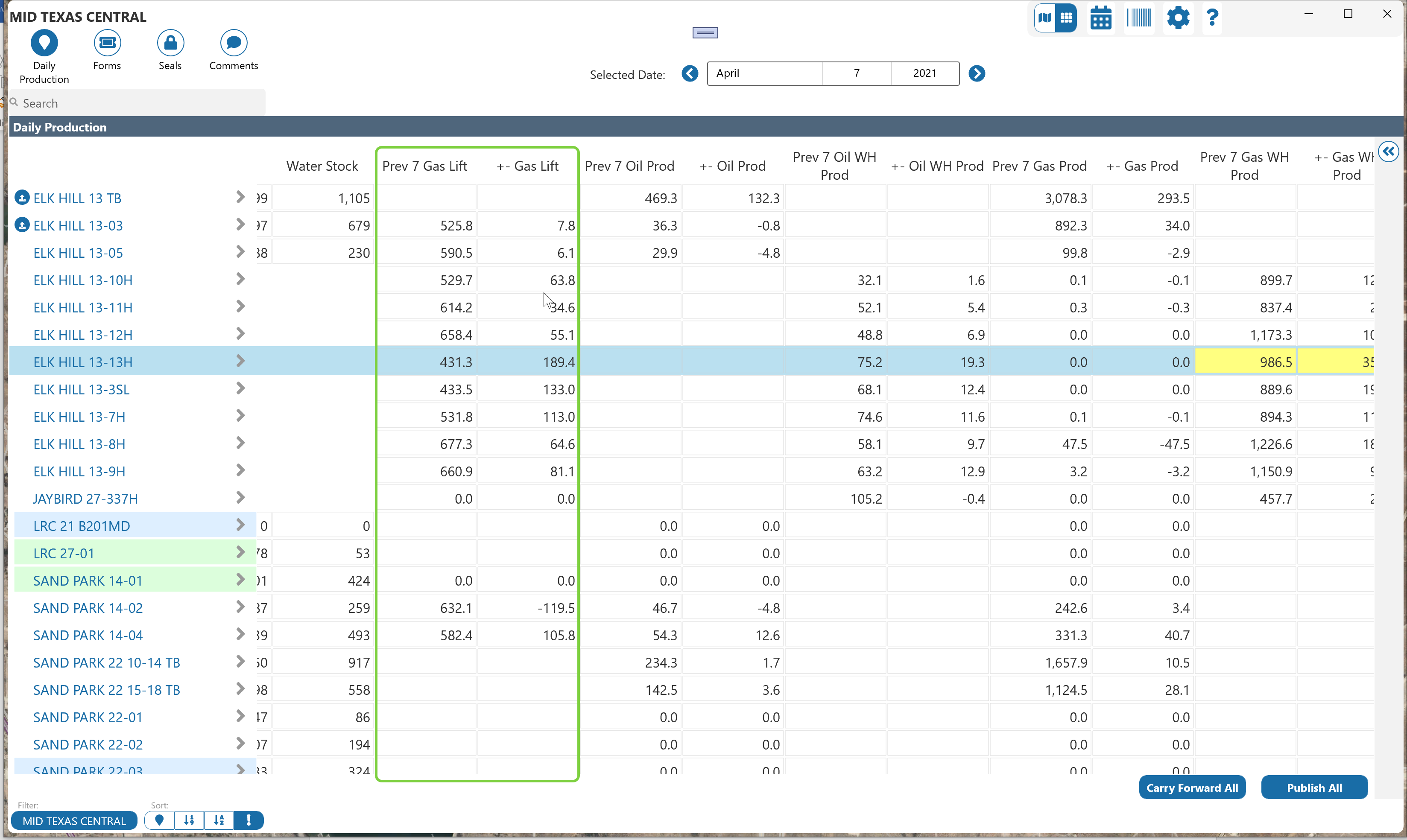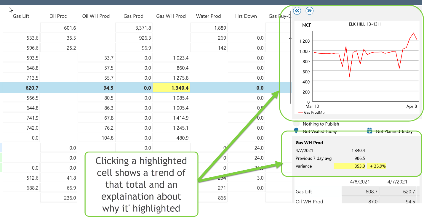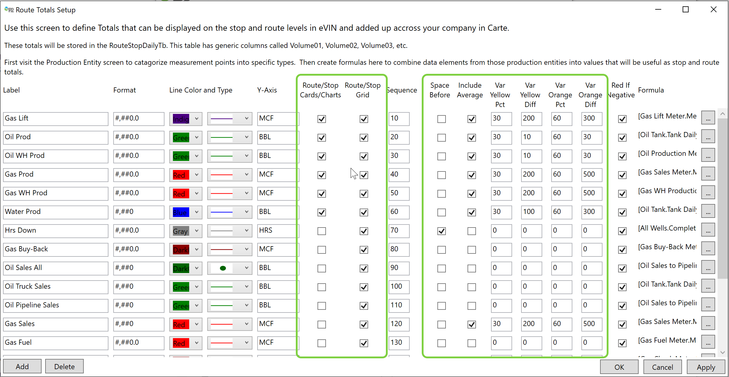 If the ‘Include Average’ option is selected, the total can also be configured to highlight in Yellow or Orange if the variance from the previous average is outside the tolerance set here. The variance must meet both the volume and percent criteria to turn color. This keeps the user from being alerted on low volumes. For example, if a well produces 2 MCF per day and today it produced 1 MCF, the user should likely not be alerted. But if a well produces 2,000 MCF per day and today it produced 1,000 MCF, the system should alert the user.