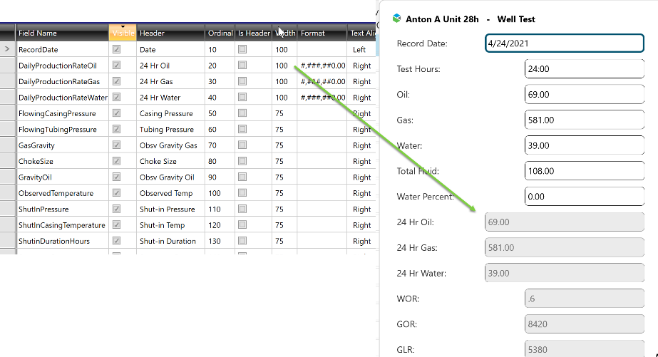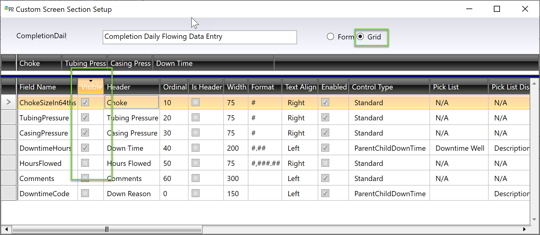 The Header on the Grid configuration is used as the label for the field on the Daily Readings screen in Field Operator. Labels configured the Form view are only used in ProCount and do not affect Field Operator. Other attributes on the Grid configuration such as Format, Text Align, Enabled, Control Type, Pick List and Default Type also are applied to the Daily Readings screen in Field Operator.