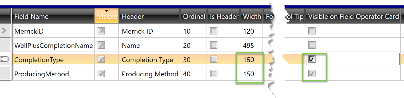 Next, switch to Grid View and ensure that the picklist properties and text alignment are set correctly here as well. Mark each field that you’d like on the Entity Header in Field Operator with Visible on Field Operator Card. Also adjust the column’s Width as this setting is used by Field Operator.
