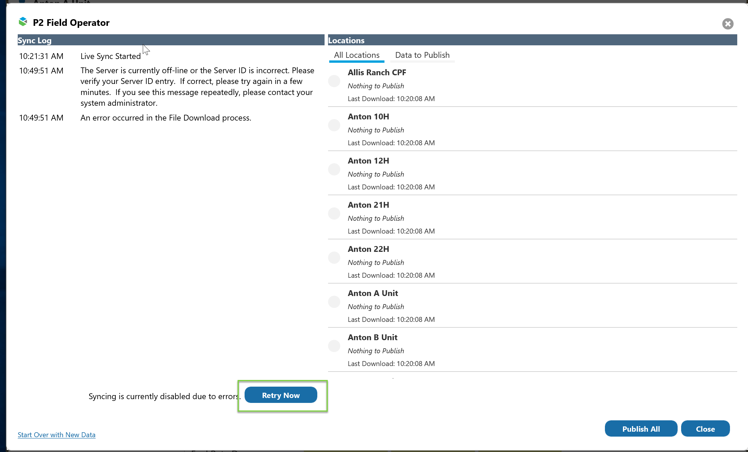 Tap the word Error to visit the Sync Status screen. The log should have a message stating that the Field Operator Server is offline. Tap Retry Now to re-download the data from the Downloads folders on the server.