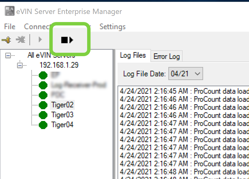 2. Stop and start the eVIN Instance in the eVIN Enterprise Manager and wait for the message ‘ProCount Data Loader Initialized’ in the log.