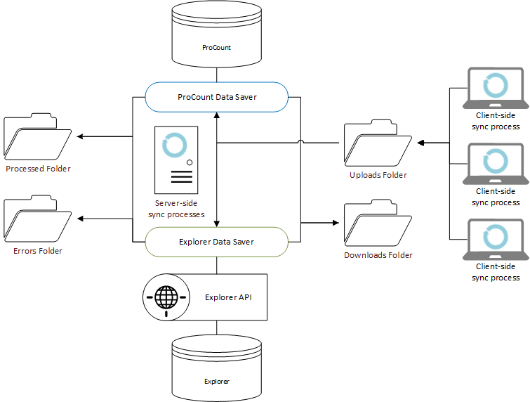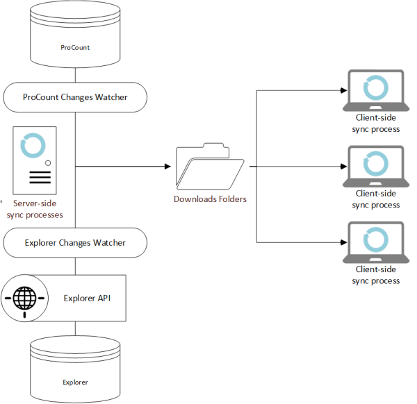• On the server the data sources (ProCount and Explorer), are polled for changes and the latest version of the data is stored in the download folders ready for the remote devices.