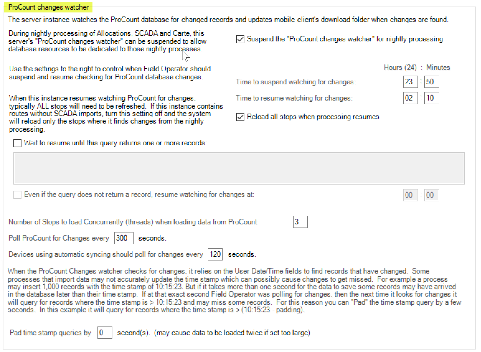 It is highly recommended that if you set the Wait to resume until this query returns one or more records setting that you also set a time to resume even if the query does not return results. If allocations normally finish at 5:00 for example, but it’s still running one day at 6:00, you may want to let the Field Operator Server begin preparing downloads folders even if allocations is still running. If the ProCount changes watcher is suspended, the users will get no readings for today when they sync.
