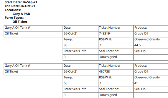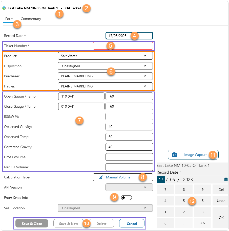Seal readings may be entered in a Ticket form. |