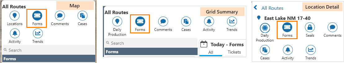 Select Forms on the Navigation Ribbon in Map, Grid Summary, or Location Detail.