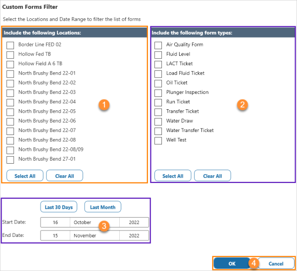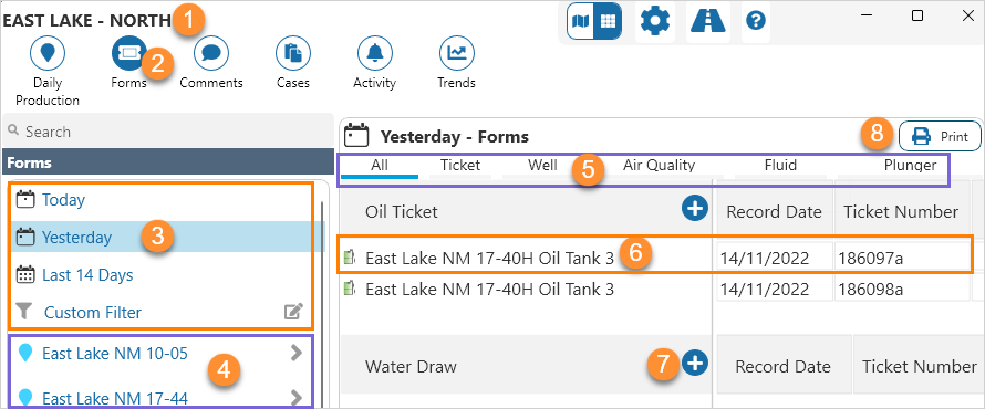 | 3 | Time Frame | Click Today, Yesterday, Last 14 Days, or the Custom Filter (see below) to filter the list of forms. |