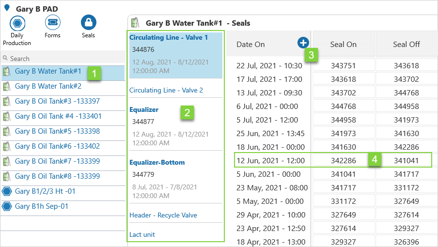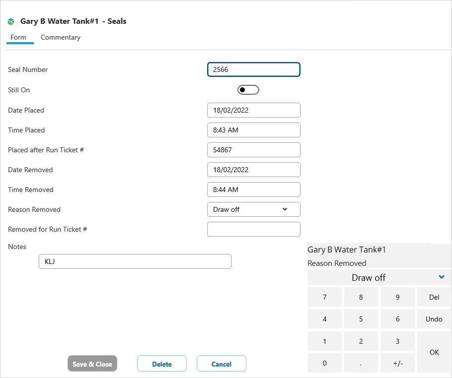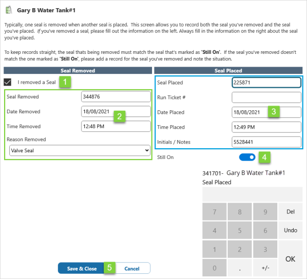 In Field Operator, you can record both the seal you removed, and the seal you placed, on the same form. You also have the option of entering seal information when completing the relevant oil ticket.