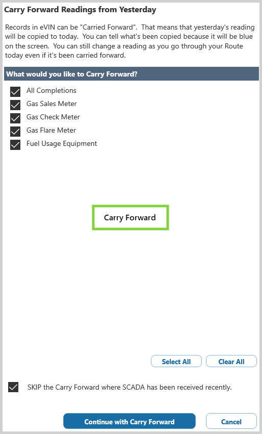 The Carry Forward function allows you to copy yesterday's readings forward to today. Carried forward fields are marked in blue, and all fields are editable.