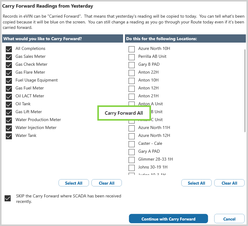 The Carry Forward function allows you to copy yesterday's readings forward to today. Carried forward fields are marked in blue, and all fields are editable.