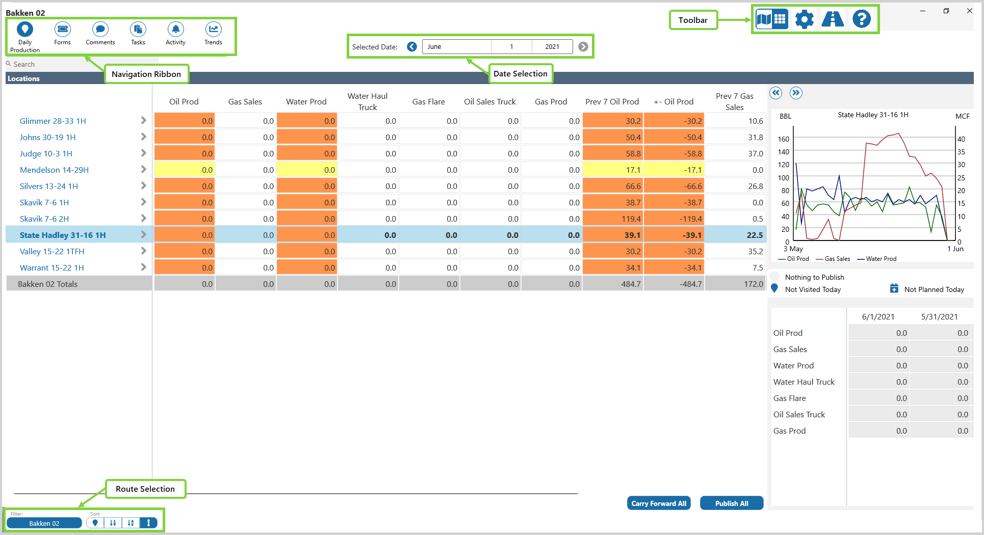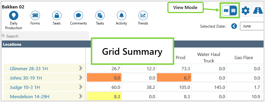 | Navigation Ribbon | This is the main way to access many of the Field Operator options. In the Grid Summary, the ribbon contains the Daily Production (Locations), Forms, Comments, Tasks, Activity, and Trends buttons. |