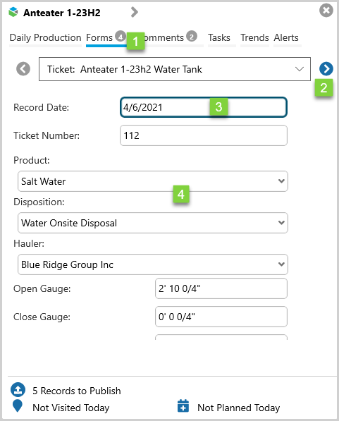 | 2. | Ribbon | Select from Daily Production, Forms, Comments, Tasks, Trends, and Alerts. Tasks and Trends are only available to Route Surveillance users. |
