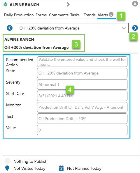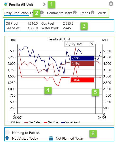 | 2. | Ribbon | Select from Daily Production, Forms, Comments, Tasks, Trends, and Alerts. Tasks and Trends are only available to Route Surveillance users. |