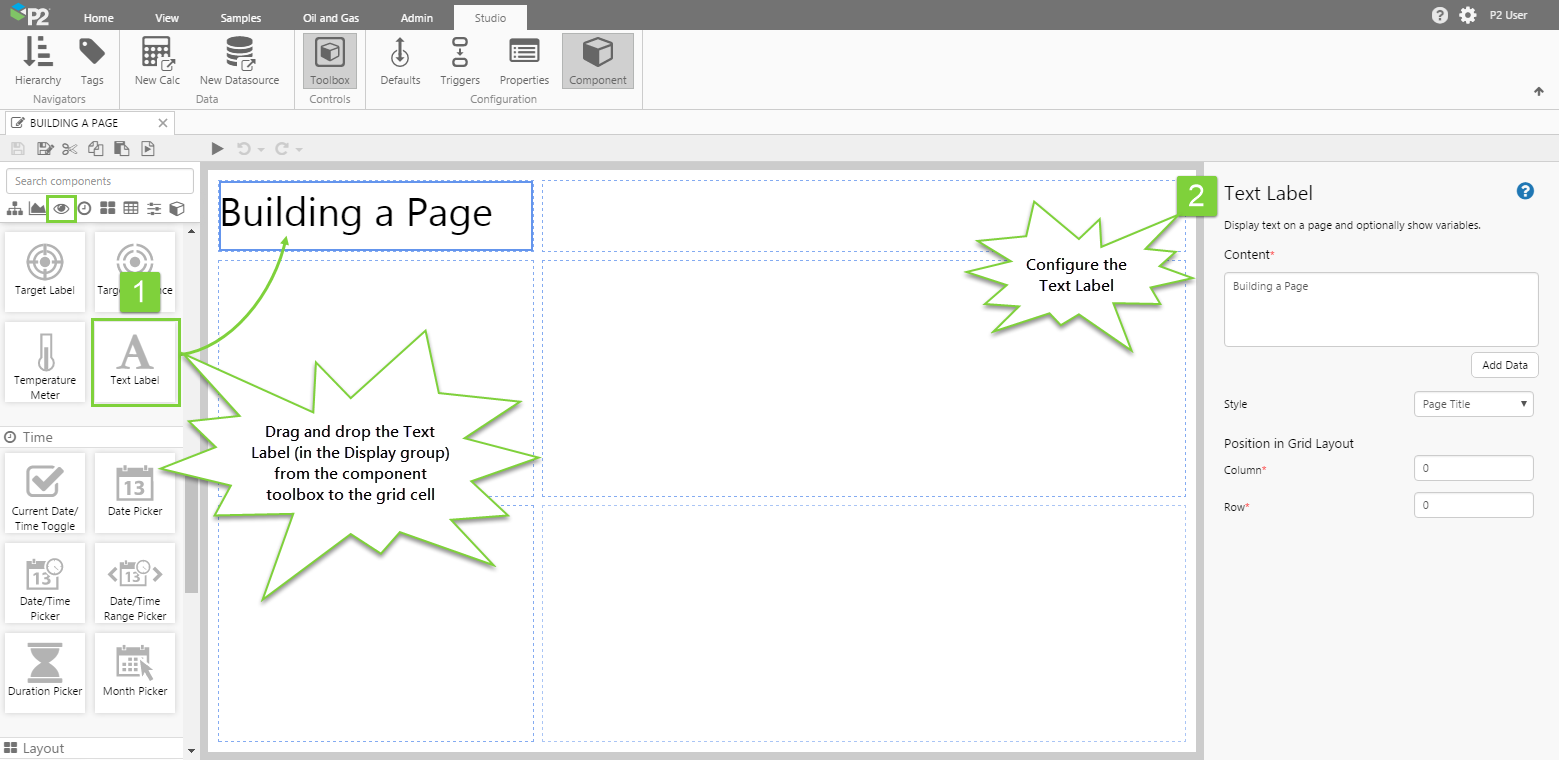 Drag and drop the Data Label from the component toolbox to the grid cell at the top right of the canvas.