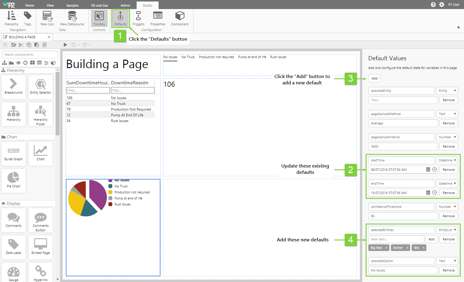 Variables are the key to creating dynamic pages, where users can pick and choose things like the date or the entity they are interested in. In this example, we will get the user to choose which downtime reason they are interested in.