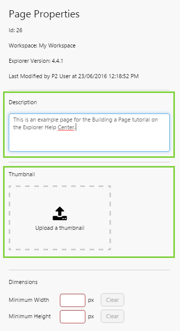 At the end of this tutorial, we will update the description and upload a thumbnail. However, it is worth noting here that if you want to build a page of a certain size, this is where you can enter the dimensions. This allows you to define when scrollbars appear when the browser is resized, and is useful for making sure your page elements remain readable.