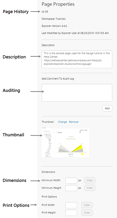 Explorer's page properties display audit information for each page, as well as page details (workspace, ID, Explorer version when the page was created). This is where you supply a page description, and where you can set the minimum page dimensions, as well as print options.
