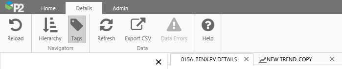 tag-ribbon-icon Tags Toggle button to open/close the Tags Navigator. Use this to search or navigate to tags. You can open a tag's Point Detail page from here.