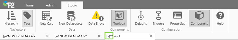 Tags Toggle button to open/close the Tags Navigator. Use this to search or navigate to tags that you can drag onto a Studio page or into a component's properties. You can also open a tag's Point Detail page from here.