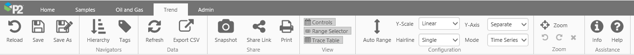 The Trend ribbon tab is activated when the currently selected tab in the display area is a Trend. Use the buttons on this tab to manipulate the trend.