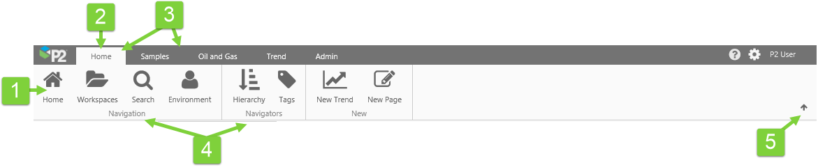 | Home | Opens the home page in a tab inside P2 Explorer. A designated page can be configured as the Home page for a user group, by an administrator. If there is no designated page for the logged-in user, then this is greyed out. | |