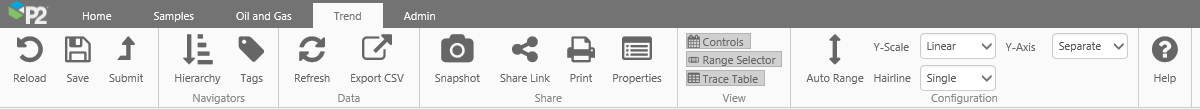 | Controls | Toggle button to show/hide the Trend Controls (date selectors, sample method and sample interval). Hiding the Trend Controls allows more space for the Trace Window. | |