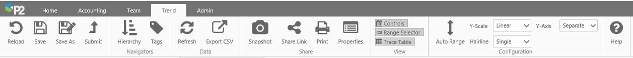 The Trend ribbon tab is activated when the currently selected tab in the display area is a  Trend. Use the buttons on this tab to manipulate the trend.