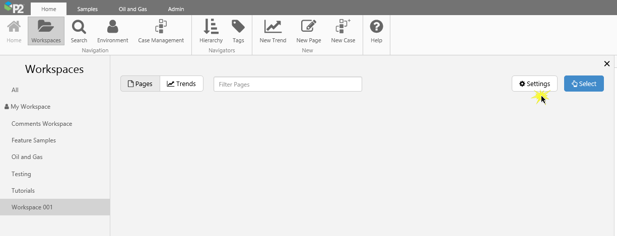 Click the Settings button to open the Settings view for the workspace's pages or trends.