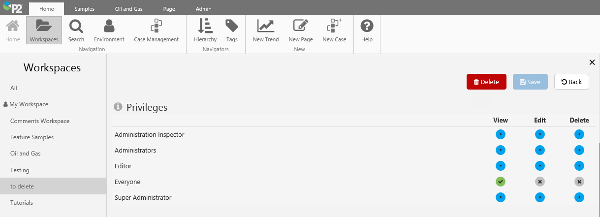 Note that privileges on a workspace apply to the workspace, and the displays (pages and trends) within that workspace, as well as displays submitted to that workspace.