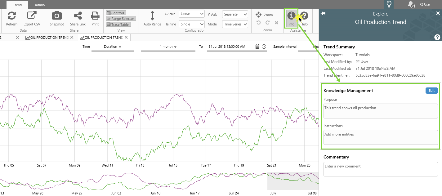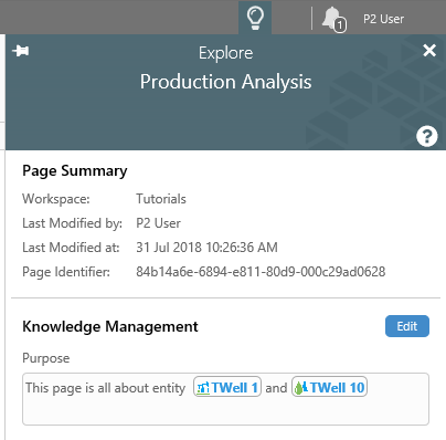 Access Knowledge Management by clicking the info button on a trend ribbon tab, page ribbon tab, or from a page's info button, to open the Explore panel.