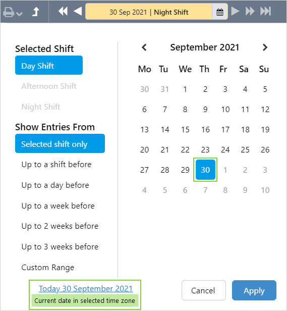 4. Workbook - Shift Picker - Today After selecting a different time zone, the date in Explorer will be the current date in the selected time zone. |