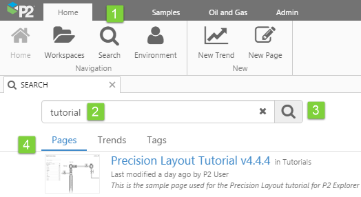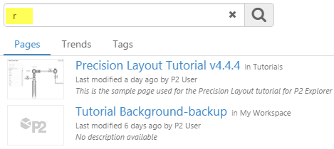 Pages with names or descriptions matching the search criteria appear in a list in the search tab.
