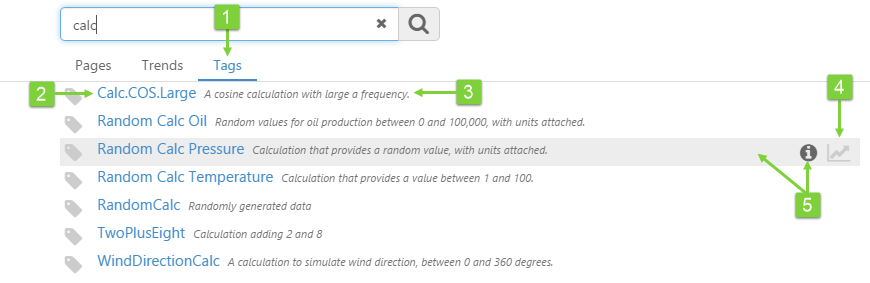 | 4. Click the trend icon to open the tag's trend | 5. Click the information icon, or click on a row, to open the tag's point details. |