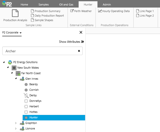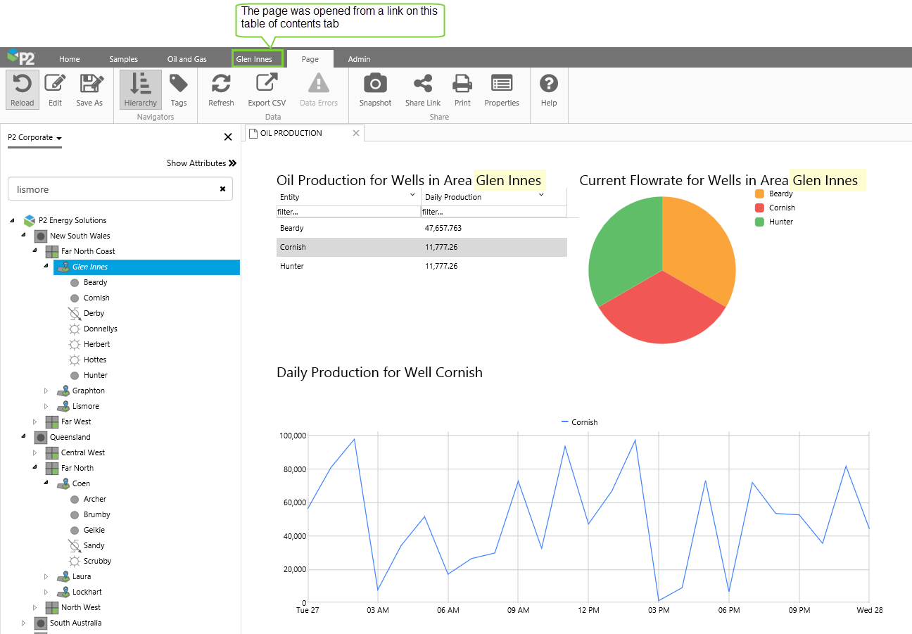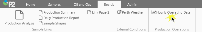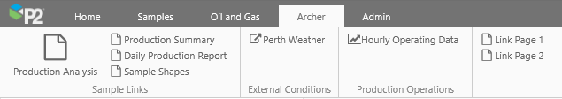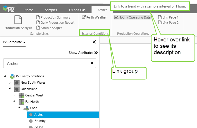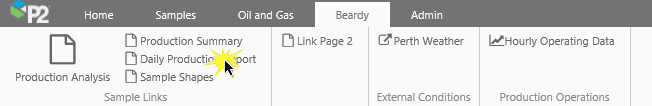 The ribbon contains links to various pages, trends, or external sites. These links have been configured for templates to which your entity belongs. For example, all entities using the 'Oil Producing Well' template show this template's links on their table of contents: 'Daily Production Report', 'Oil Production', 'Well Trend', etc. If the selected entity has secondary templates, those templates' links are also shown on the ribbon tab.