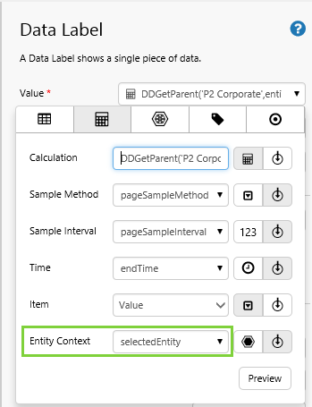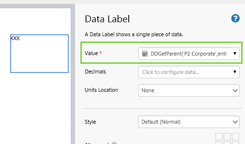 The calculation expression is: DDGetParent('P2 Corporate',entity,-2, 'Area'). This means the data label will show the first parent of the selected entity (within two levels above the selected entity) that uses the 'Area' template, in the 'P2 Corporate' hierarchy.